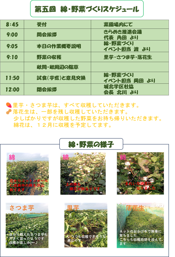 第四回綿・野菜づくり交流会にご多忙な中、ご参加いただきありがとうございました。さつま芋の収穫や綿の摘みとり体験、意見交換会で交流を深めていただくとともに、少しばかりですが、収穫したさつま芋をお持ち帰りいただくこともでき良かったと思います。